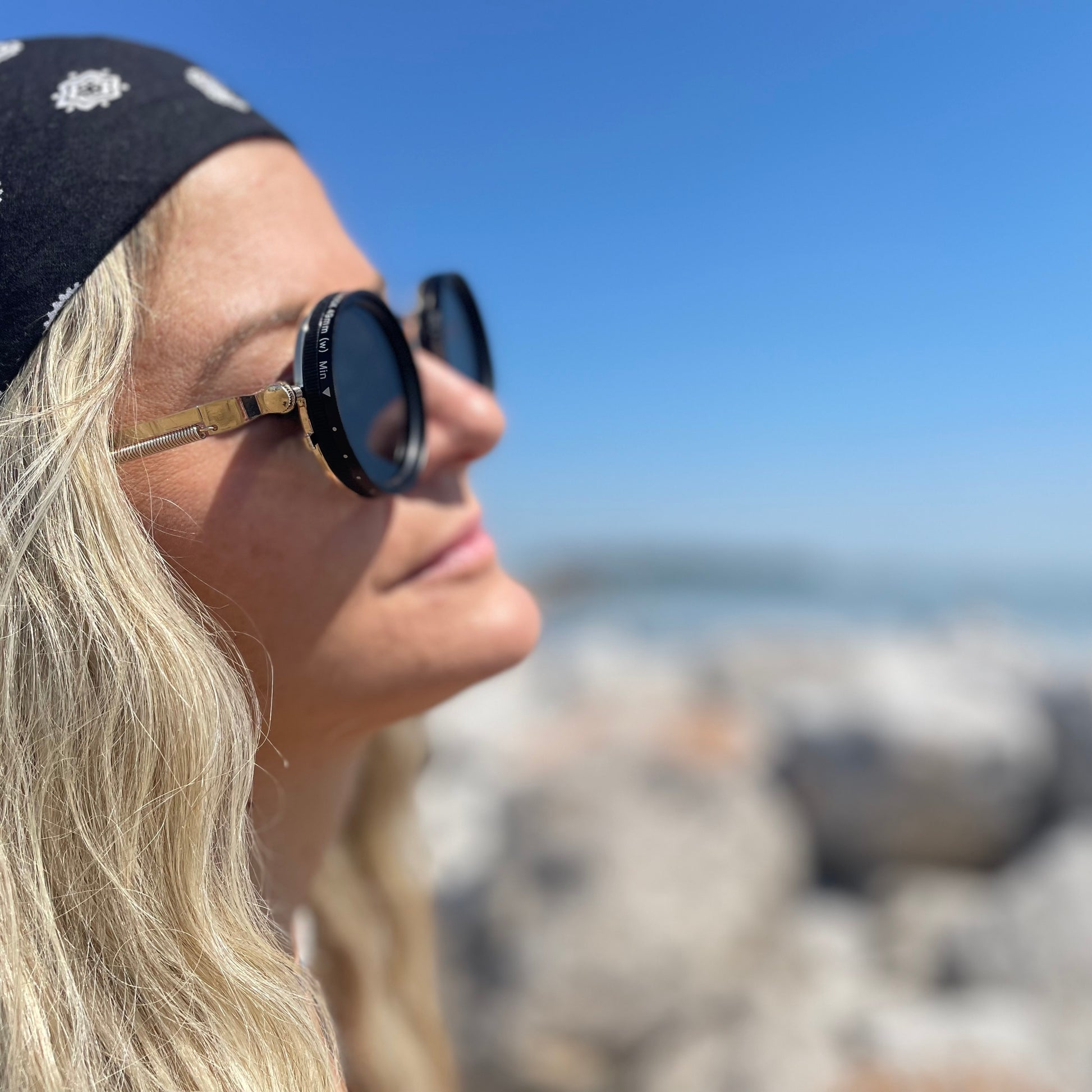 Unsere Sonnenbrillen verfügen über einen innovativen Drehmechanismus im Rahmen. Damit kannst du die Tönung der Gläser in 9 Stufen manuell anpassen – ganz ohne Elektronik oder App. Ideal für wechselnde Lichtverhältnisse.